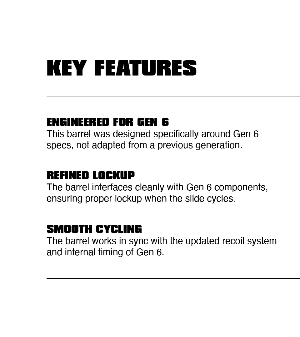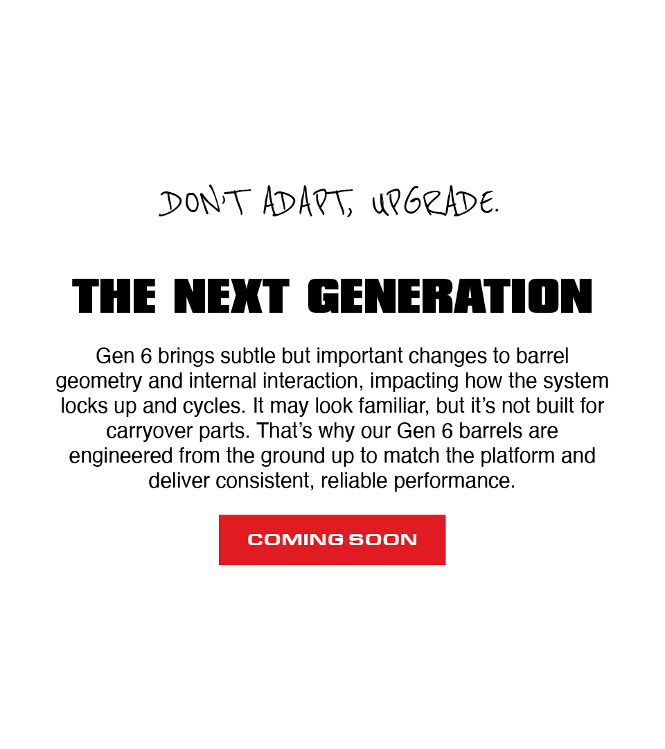 Gen 6 changed the details. Built for reliability and performance, so your setup runs flawlessly from first round to last. Engineered for reliability, tested for performance, available in threaded options, our Gen 6 barrels give you the flexibility and assurance your build demands